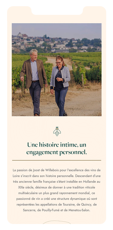 Het menu en de paginastructuur ("Een reis langs de Loire", "Een unieke druivensoort") ensceneren de ontdekking. Je navigeert niet door een technische catalogus, je volgt het pad van de Loire.